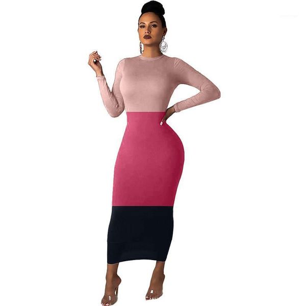 casual dresses color block bodycon maxi dress women fall 2021 long sleeve slim stretch elegant tight fitted party night club, Black;gray
