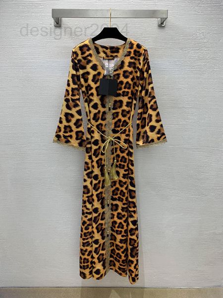 casual dresses designer fashion embroidery lace stitching leopard print v-neck wide sleeve large swing dress with tassel belt k9dk, Black;gray