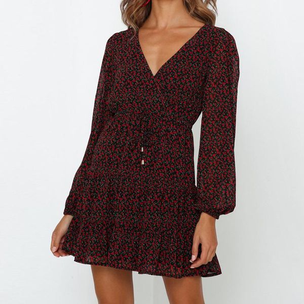 casual dresses fashion autumn 2021 women floral print dress long sleeve v-neck with belt female elegant party streetwear vestidos, Black;gray
