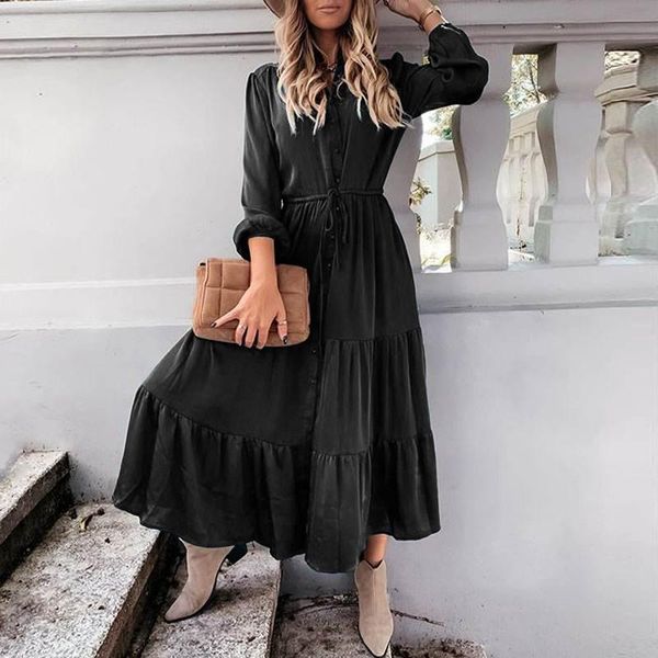 casual dresses fashion women long shirt dress lapel sleeve belted solid elegant work sundress pleated party vestido 2021, Black;gray