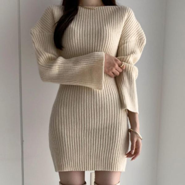 casual dresses french elegant split sleeve knitted sweater dress women chic autumn winter solid ladies mini short bodycon pullover knitwear, Black;gray