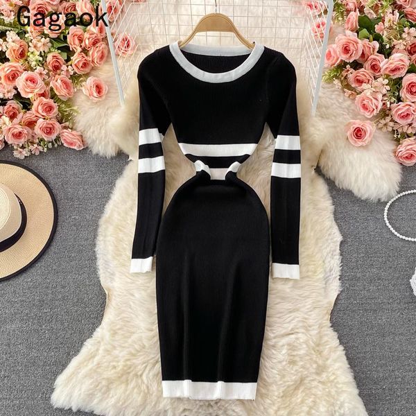 casual dresses gagaok sweater dress women 2021 spring autumn o-neck sheath striped knitted midi bodycon fashion chic wild vestidos, Black;gray