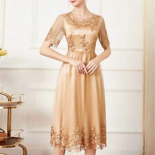 casual dresses high end expensive boutique mesh embroidered dress round neck short sleeve waist closing thin medium and long skirt xia 1153, Black;gray
