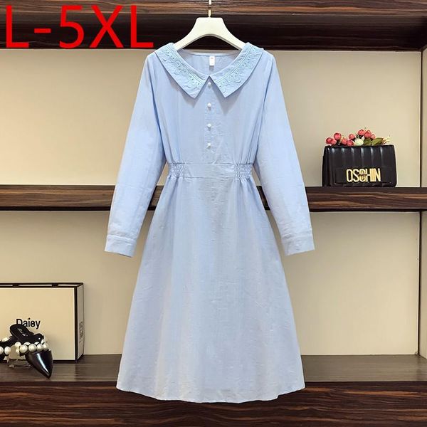 casual dresses l-4xl plus size women blue elegant jacquard dress autumn 2021 lace doll collar long sleeve elastic high waist midi s212, Black;gray