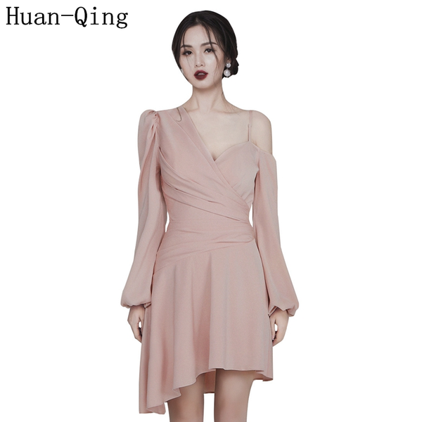 casual dresses office lady off-the-shoulder asymmetrical dress spring runway women v-neck long sleeve slim elegant party mini, Black;gray