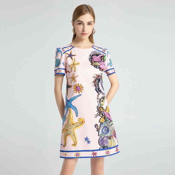 casual dresses pink short skirt women's wear spring and summer 2022 loose waist nail bead diamond studded starfish conch print dress yf, Black;gray