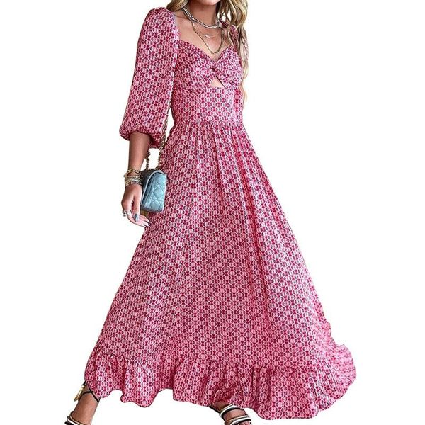 casual dresses selling women floral print ankle-length dress 2021 summer sweet girl square collar hollow out lantern sleeve a-line, Black;gray