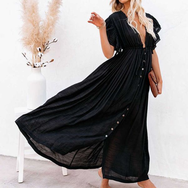casual dresses summer ladies beach long dress 2021 pure color single-breasted waist drawstring beach holiday cotton and linen sunscreen dres, Black;gray