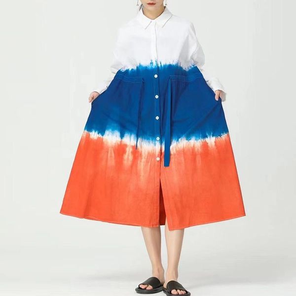 casual dresses superaen autumn 2021 fashion original slim turn down collar full tie-dyed a-line mid-calf for women, Black;gray