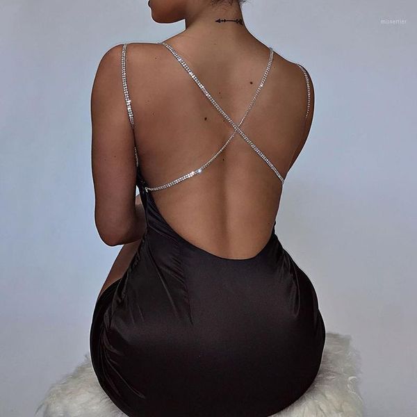 casual dresses v neck backless satin silk dress 2021 celebrity back cross diamonds chain high waist slim mini night club wear, Black;gray