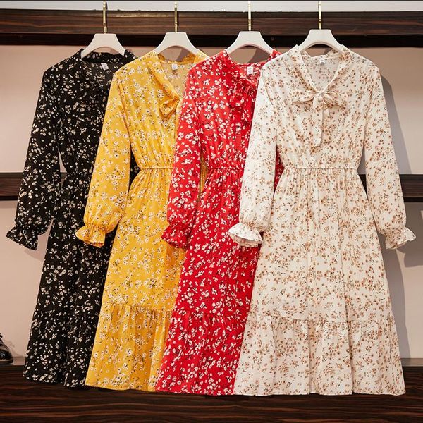 casual dresses women chiffon dress floral print midi 2021 elegant party ladies long sleeve robe femme vestidos clothes, Black;gray