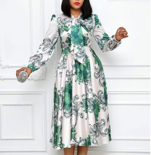 casual dresses women long sleeves printed with bowtie collar pleated high waist midi elegant ladies fashion african vestidos robes3096754, Black;gray