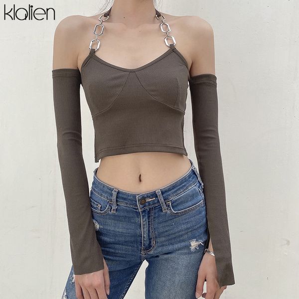 casual fashion solid rib knit long sleeves halter t shirt for women autumn new simple stretch wild crop streetwear, White