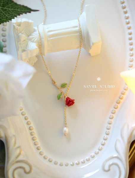 chains little red rose original flower restoring ancient ways is cute fairy clavicle necklace, pearl pendants, Silver