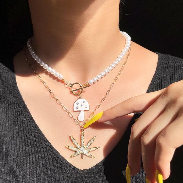 chains multi-layer elegant pearl mushroom pendant necklace for women fashion crystal big metal chain necklaces jewelry, Silver