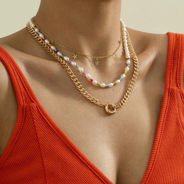 chains simple necklace with alloy beaded personality geometric star rice bead jewelry for women party gifts wholesale, Silver