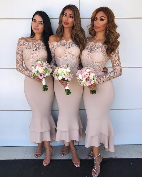 champagne mermaid lace bridesmaid dresses long sleeves off the shoulder country maid of honor gowns ankle length wedding guest dress, White;pink
