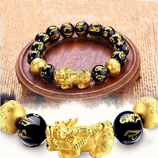 charm bracelets 2021 feng shui obsidian stone beads bracelet men women buddhism wristband gold black pixiu wealth good luck gifts, Golden;silver