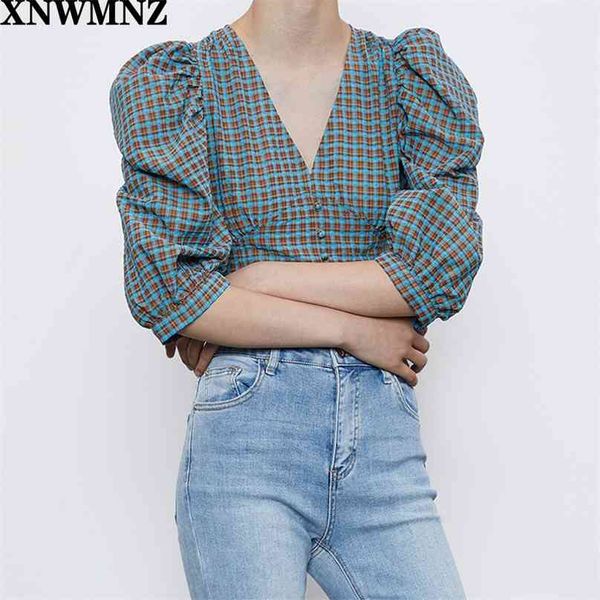 chic green fashion women shirt v-neck puff sleeve plaid short ladies casual stylish slim british style t-shirt vestidos 210520, White