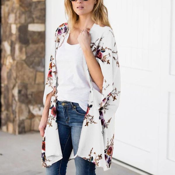 chiffon long blouse women kimono cardigan long sleeve floral print blouses casual loose boho blusa shirts oversized 2021, White