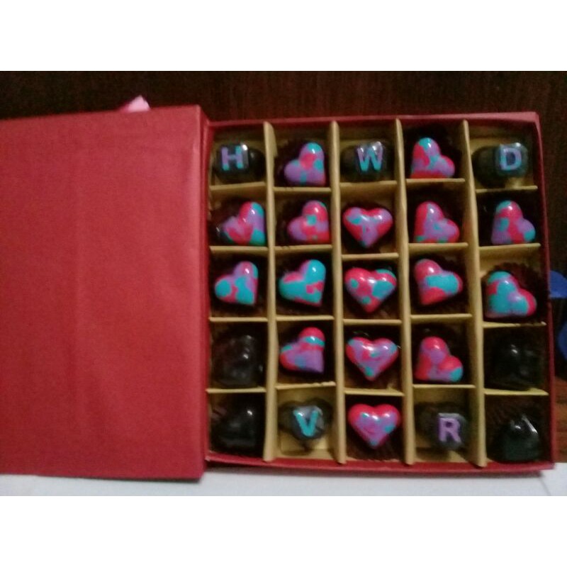 Cokllat praline sekat 25 yang cocok banget untuk kado ulrah atau pernikahan yang di kemas dengan hard box..warna coklat bisa request...huruf di sesuaikan dengan sekatnya.