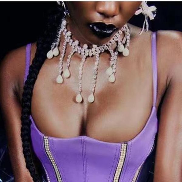 chokers elegant rhinestone long tassel pearls necklace statement choker jewelry for women crystal collar wedding, Golden;silver