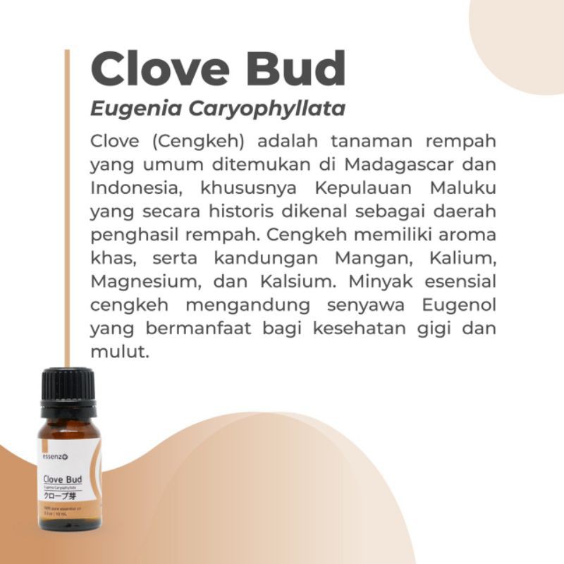 Clove Bud Essential Oil dari Essenzo ini sangat berkhasiat untuk mengatasi Sakit Gigi, karena Clove Bud Essential Oil dari Essenzo terbuat dari 100% konsentrasi liquid Cengkeh Alami tanpa ada bahan campuran apapun.