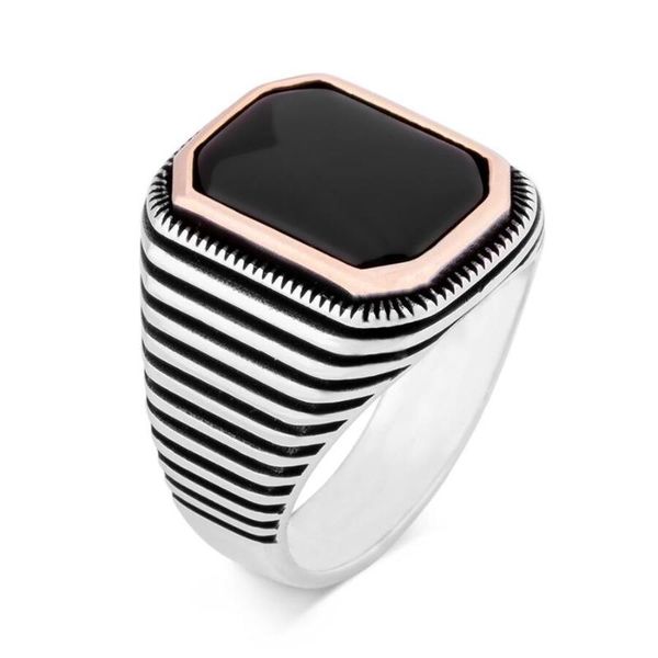 cluster rings men silver ring with black onyx stone meridian motif, made in turkey, solid 925 sterling, Golden;silver