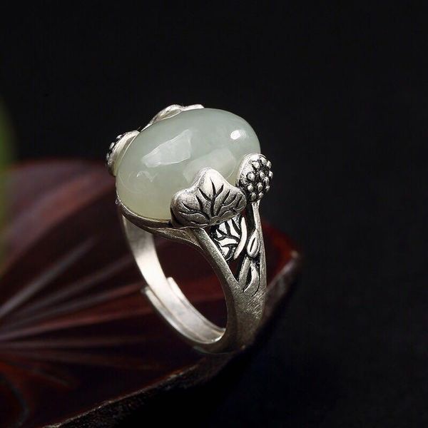 cluster rings natural hetian white jade lotus open adjustable ring chinese retro light luxury elegant fresh charm lady silver jewelry, Golden;silver