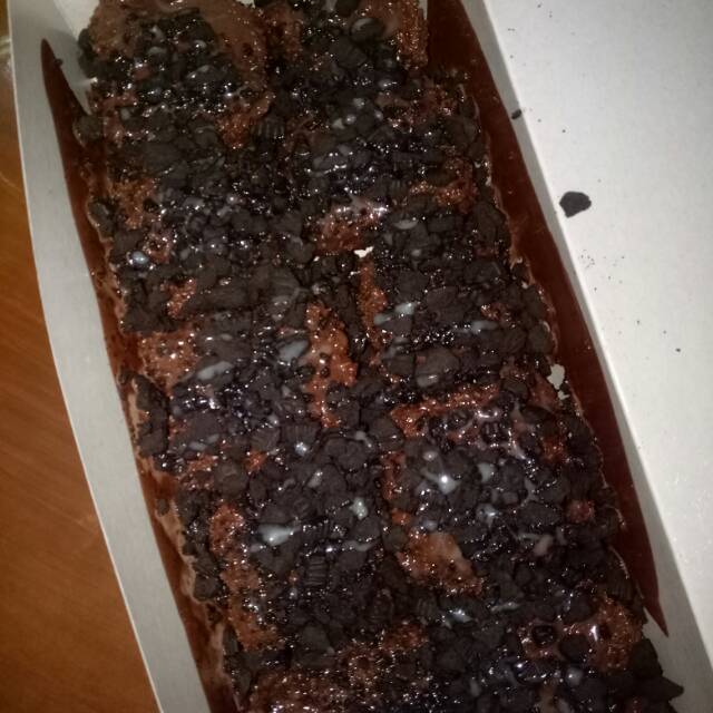 pisang nugget goreng yg di beri toping lelehan coklat, oreo crumb dan susu kental manis