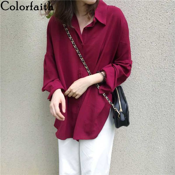 colorfaith new 2020 spring summer women's blouses loose batwing sleeve turn-down collar single-breasted solid shirts midi bl658, White
