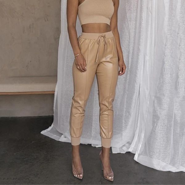cool women pu leather pants fashion street lady elastic waist pencil autumn drawstring sweatpants pockets trousers gv109 women's & capr, Black;white