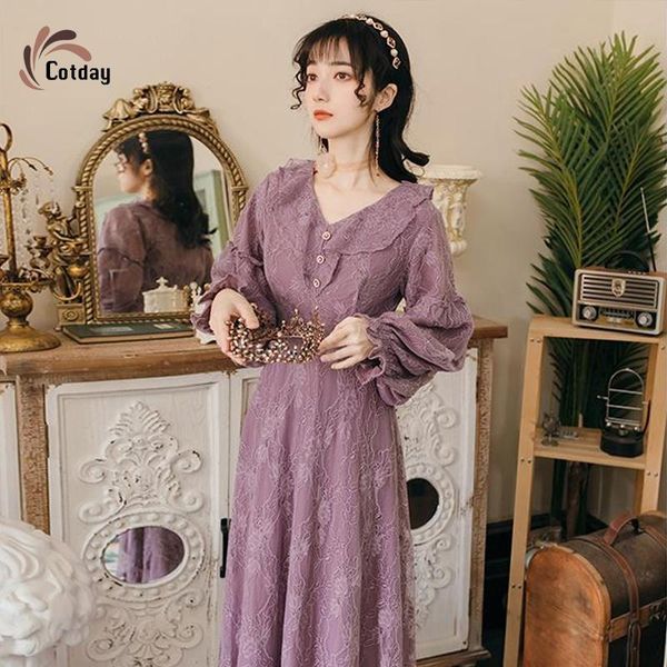 cotday purple full sleeve autumn french v-neck buttons floral ruffles fairy retro party casual long dress for women 2021 dresses, Black;gray