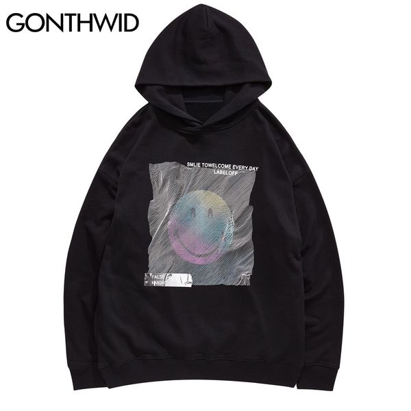 creative rainbow smile face print hoodies sweatshirts streetwear harajuku hip hop casual loose hooded mens, Black