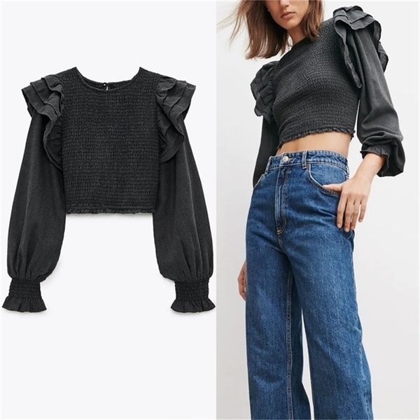 cropped ruffle stretchy women retro long puff sleeve gray smocked blouse female fashion back opening short shirt 210524, White