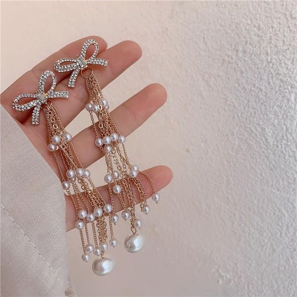 dangle & chandelier korea elegant bowknot pearl earrings temperament personality exaggerated tassel for women fashion jewelry, Silver