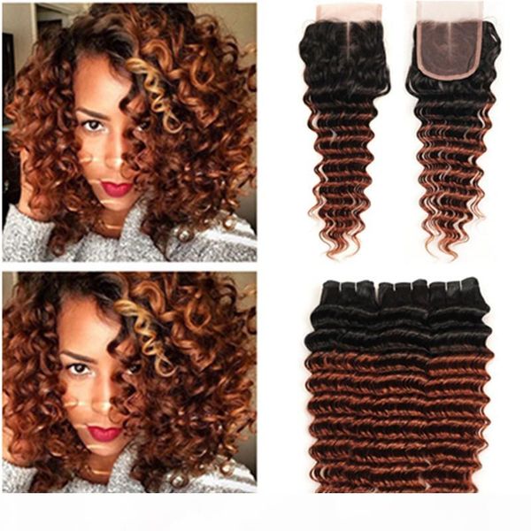 dark auburn ombre peruvian deep wave human hair 3bundles with closure #1b 33 copper red ombre lace closure piece 4x4 with weave bundles, Black