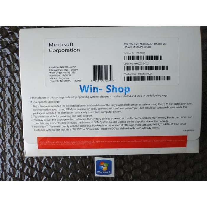 Fullbox Windows 7 Pro 64Bit (Original) + Stiker Logo + Termasuk DVD Installer Original