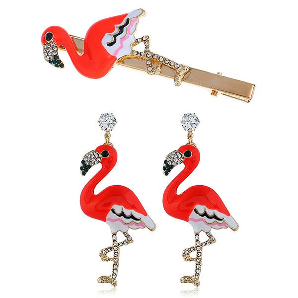 proudct: alloy flamingos earrings and hair clip jewelry set material: alloy color: red, gold, white size: 3.3*8cm, 6.8*3.3cm weight: 27g