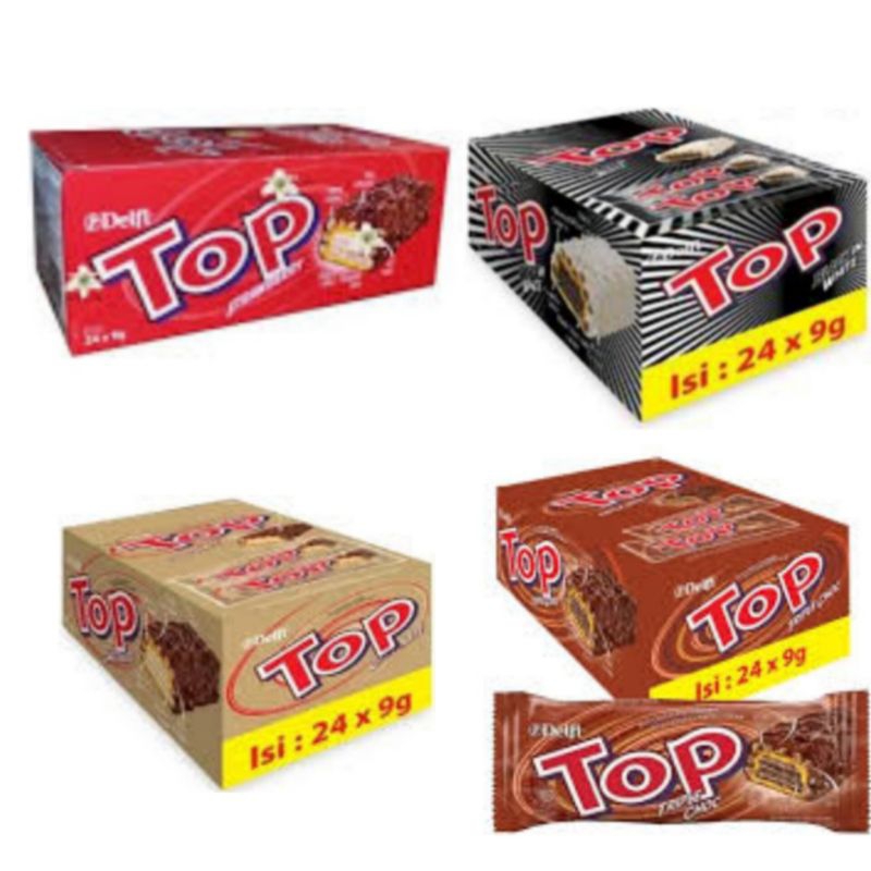 delfi wafer top satu box isi 24pcs x 9 gram : black in white, triple choco, chocolate, stroberi