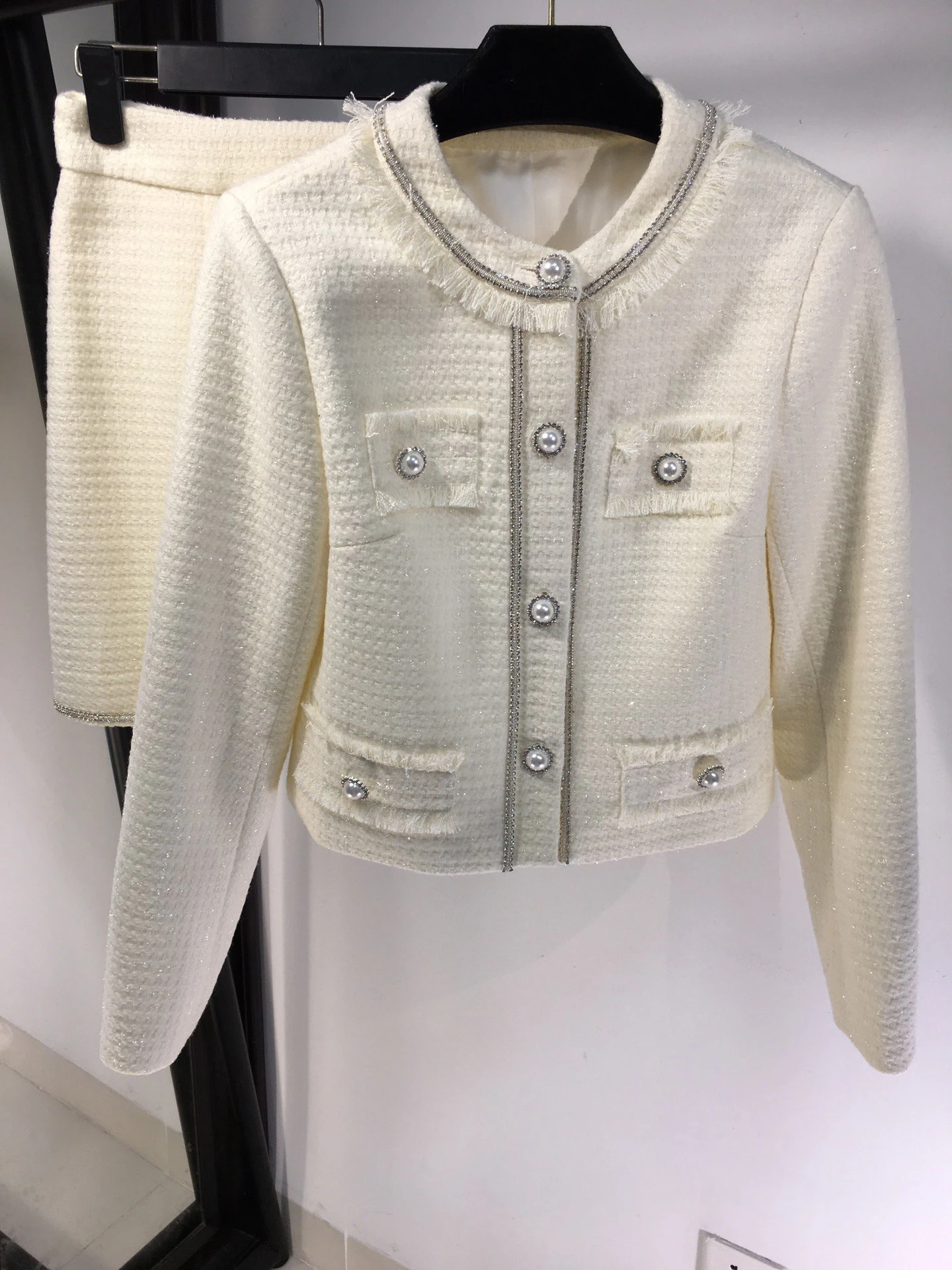 New Ladies Fashion 2021 Tweed Rhinestone Chain Round Neck Jacket + Hip Skirt 2-piece Set 1124