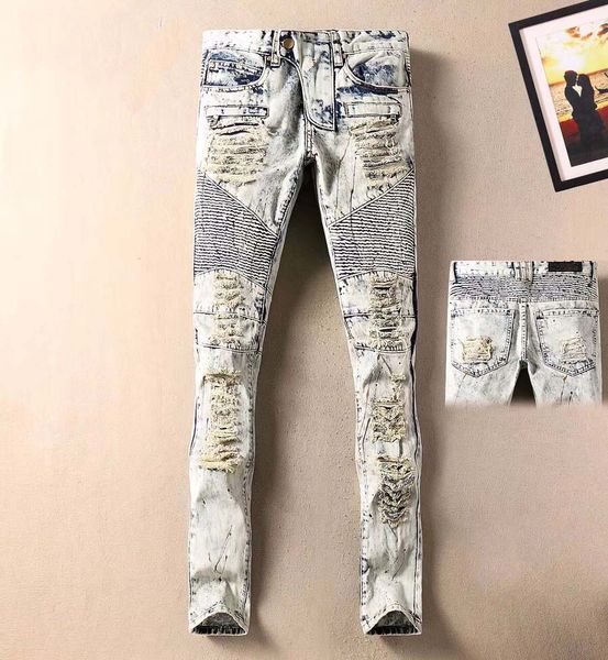 designer men luxury ba lmain jeans slim fit print brand splice washed casual pants fashion pants popularhiphop classic cowboy pants, Blue