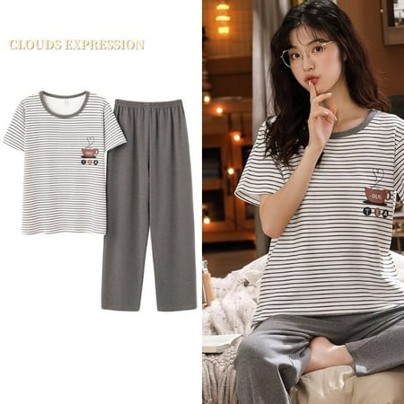 QWZNDZGR Spring Summer Knitted Cotton Cartoon Women s Pajama Sets Short Sleeved Long Pants Plaid Sleepwear Kwaii Nighty 4XL Home Fashion