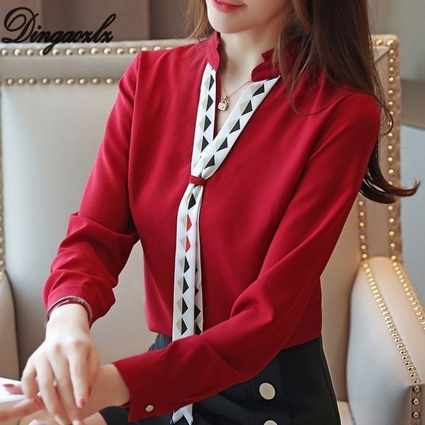dingaozlz blusa feminina elegant chiffon shirt long sleeve ladies blouse red white office lady shirt patchwork women y200828