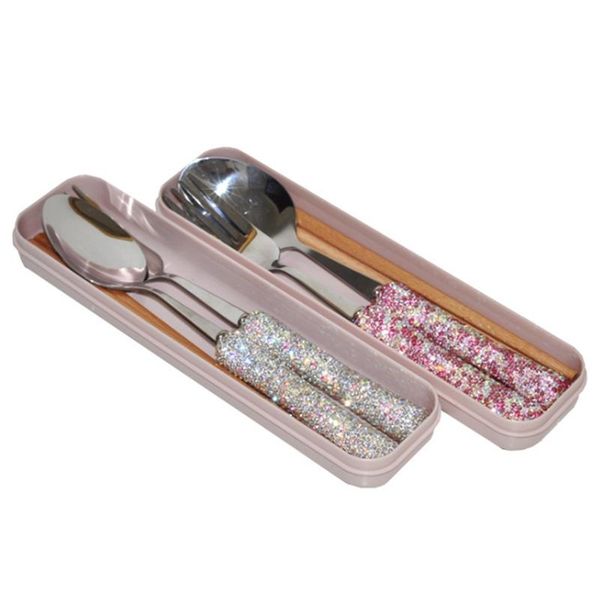 dinnerware sets diamond cutlery set,stainless steel fancy eating utensils portable tableware with box brilliant sparking spoon