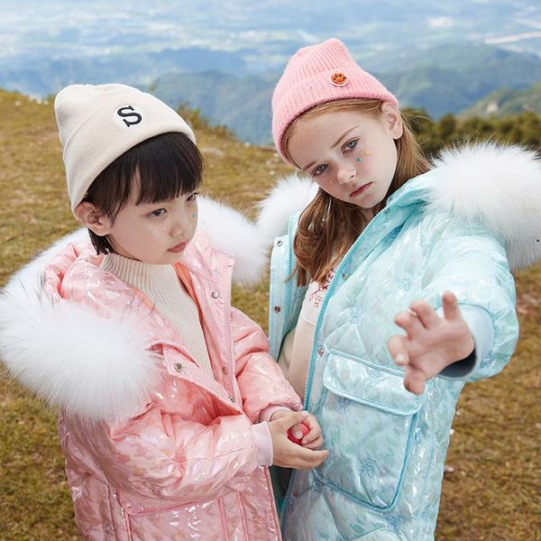down coat children's fashion winter clothing girls natural fur collar hooded warm jacket bright colorful waterproof thick long, Blue;gray
