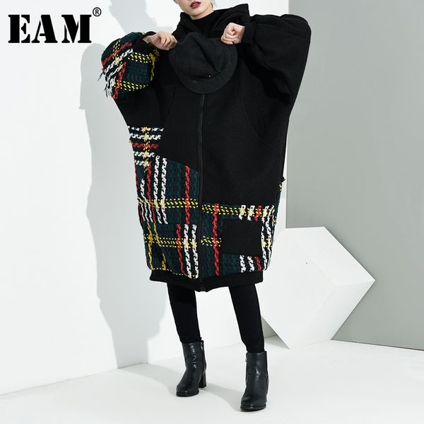 eam] сыпучие fit black plaid split большой размер куртка с капюшоном новая длинные рукава женщины пальто мода tide осень зима 2019 a713-01, Black;brown