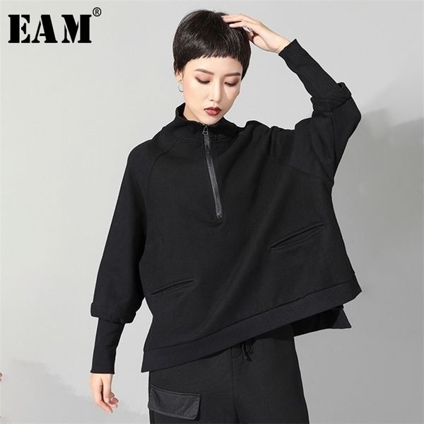 [eam] new spring autumn stand collar long sleeve black zipper split joint big size sweatshirt women fashion tide jq021 201126