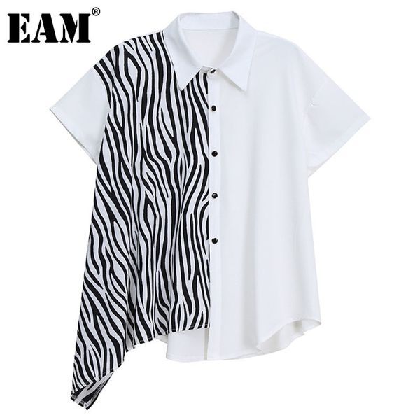 [eam] women big size irregular zebra pattern printed blouse lapel short sleeve loose fit shirt fashion summer 1dd7599 21512, White