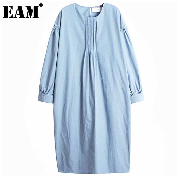 [eam] women blue pleated big size midi dress round neck long sleeve loose fit fashion spring autumn 1dd7779 21512, Black;gray